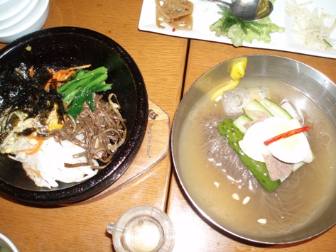 スカートキムチ(はさみで切って食べる)、様々な野菜のナムル、チヂミ、卵まき、豚キムチ豆腐、酢豚、おもちの入ったトック。それから写真にとらなかったんだけど(食べるのに夢中で(^_^;))すごく美味しい韓国のすき焼き、牛肉のプルコギを皆でつつきました。それと〆に冷麺に石焼ビビンバだったかな?