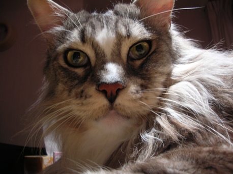 そして、テオ(本名テオドール)は7才。メインクーンという種類の男の子ですが、ものすごい巨猫で、体重はぬぁんと15キロ! メインクーンは、ジェントル・ジャイアントと呼ばれる、猫の中でもおそらくいちばん大きい種類なのですが、中でもテオは特別大きなコ。みなさん初めて見るとびっくりして「ほんとに、猫?!」 なんて言われますが猫です。猛獣じゃありません。だって性格は文字通りジェントルで甘えん坊。