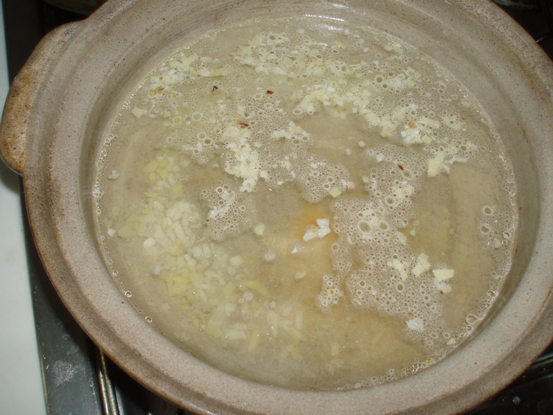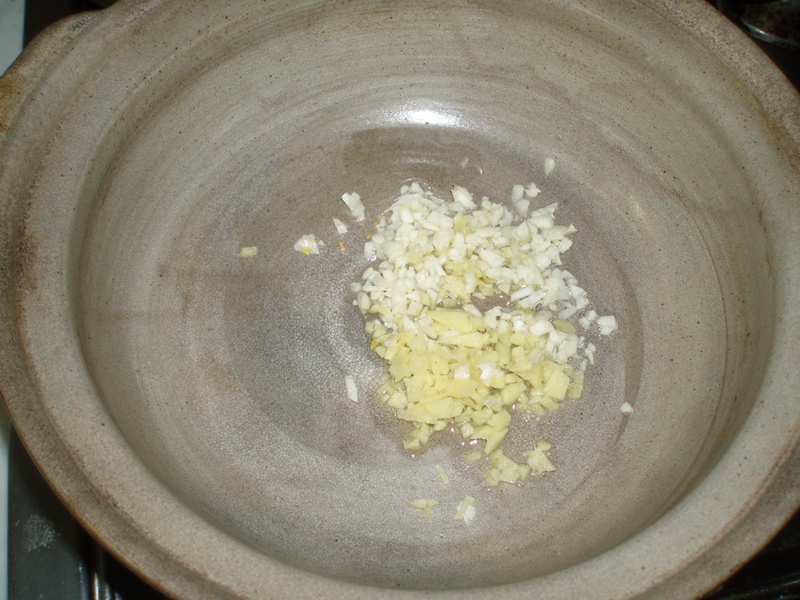 まず、にんにくとショウガのみじん切りを土鍋で弱火でよく炒める。(強火にすると焦げてしまう)
