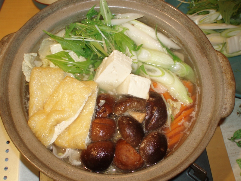 そして軽くアクをとったら、ネギ、人参、白菜、水菜、きのこ、豆腐、揚げなどを加える(水菜は最後に)。