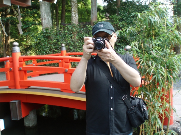 写真を撮るFrankie Tのうしろに見えているのは、神社の赤い橋。