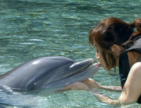 イルカにチュ!ちゃんと見てくれているようなこのイルカの目、可愛いっ!