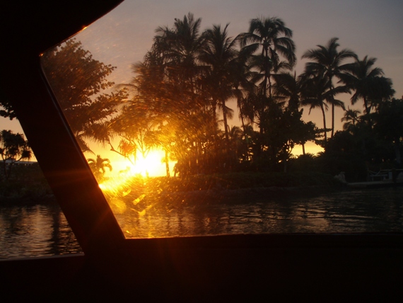 こちらは、ホテル内を移動する船から見た、金色の夕焼けです。