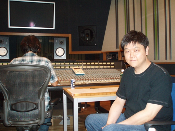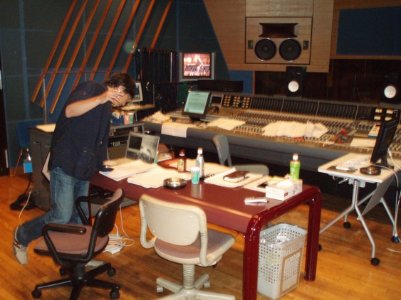 下、スタジオの風景をパチリ。こちら作編曲の寺嶋民哉さん。