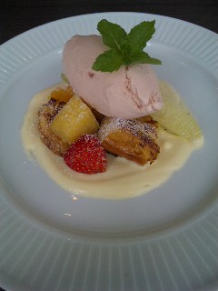 デザートは、フレンチトーストの上に、さまざまなフルーツ、上には、薔薇のアイスクリームガトッピングされた目にも美しいスイーツ。
