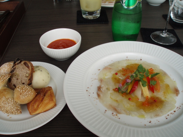 真鯛のカルパッチョ、ギリシャ風お野菜とともに。